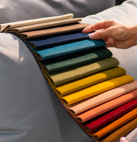 Advies over stoffen, leer en vullingen, afgestemd op gebruik, onderhoud en uitstraling.
