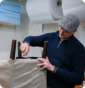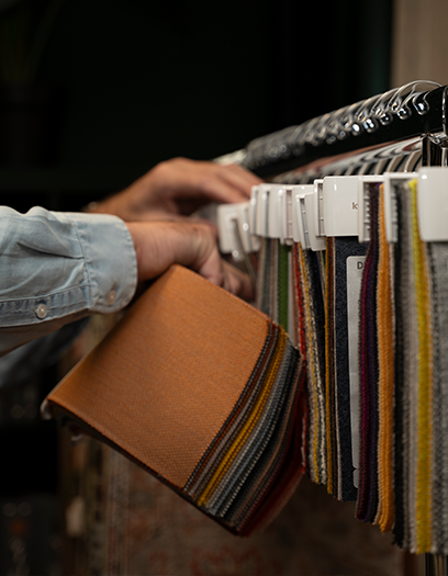 Advies over stoffen, leer en vullingen, afgestemd op gebruik, onderhoud en uitstraling.